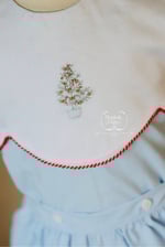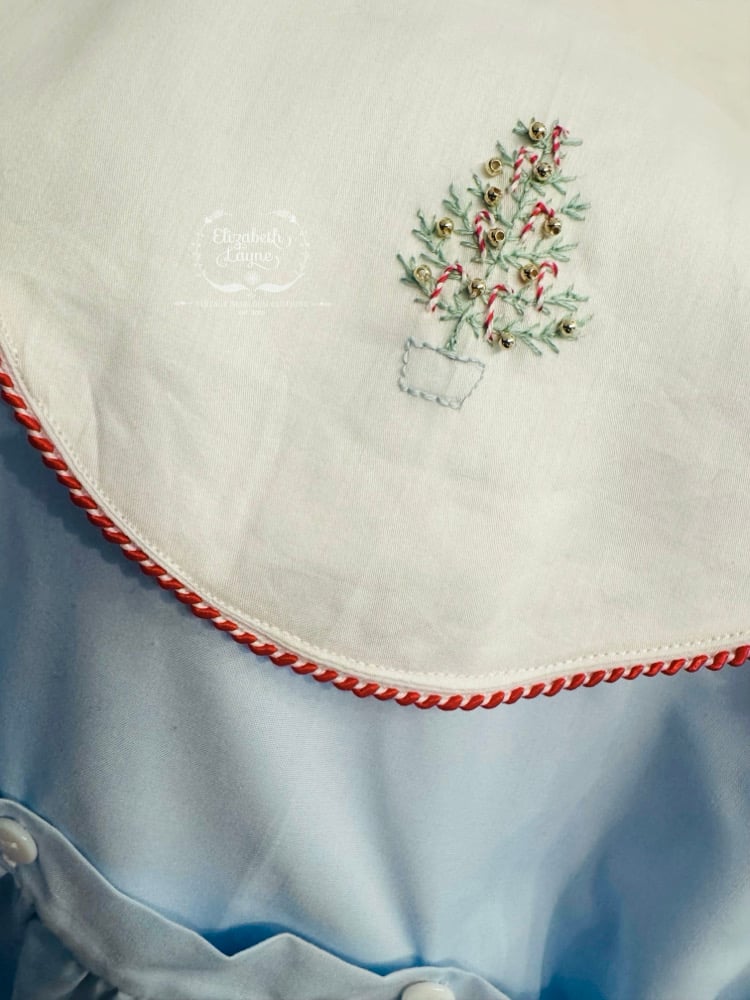• Hand embroidered Evergreen trees on our new scalloped yoke overlay feature gold ornaments and sweet candy canes