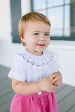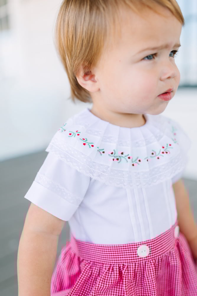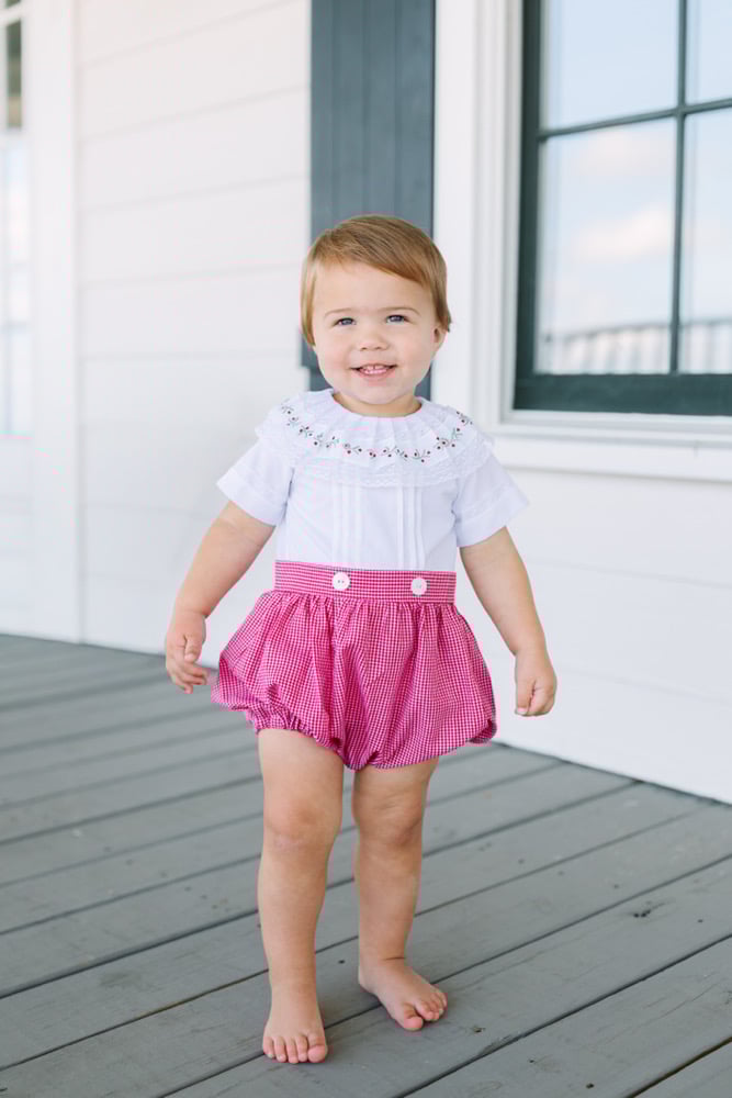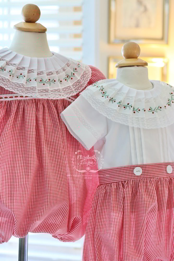 • Crisp white Imperial broadcloth bubble top and big boy shirts features Peter Pan collars piped in gingham and decorative tucks along holly insertion