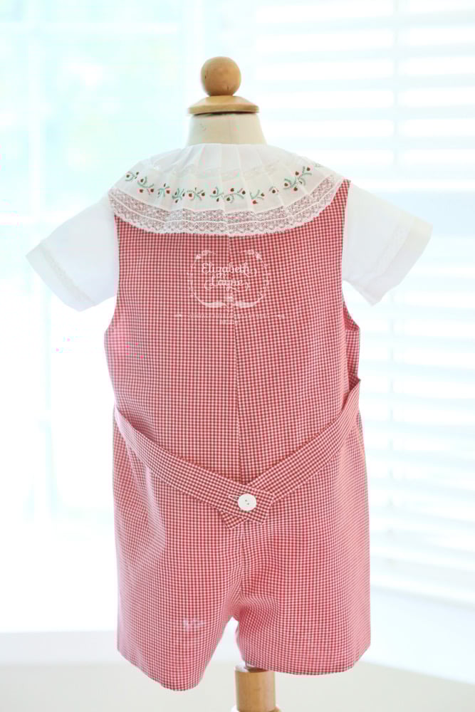 Lined gingham shortall with blet in back. Broadcloth button-up shirt with pleated collar and lace on sleeves.