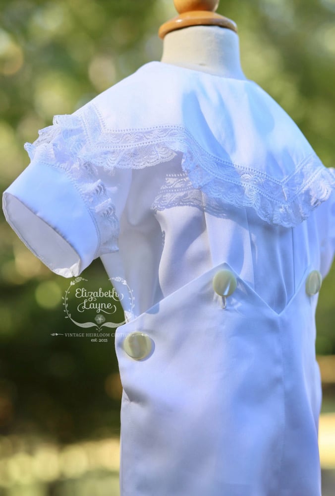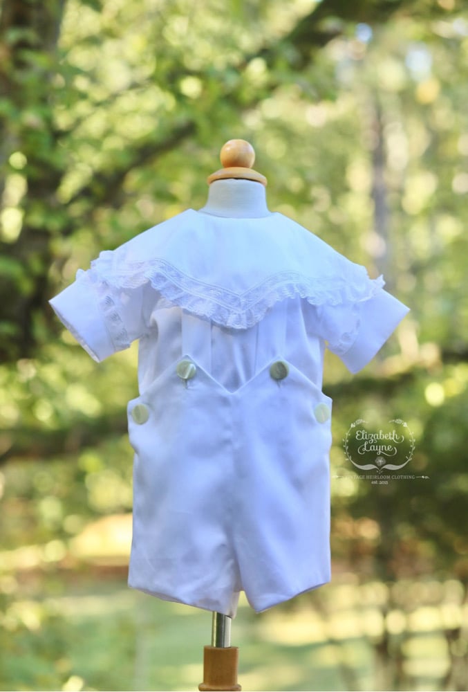 It has a bit more lace and hand finished detailing then our other boy designs and yet, still is properly proportioned to allow his sweet face to shine. đź’™