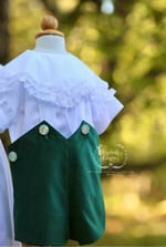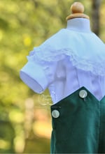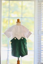 • Choose from green Japanese velveteen for his short or a white satin batiste short
