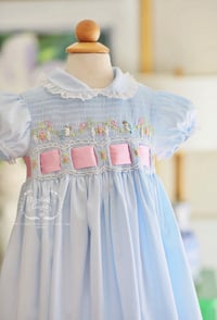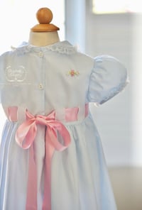 • Hand smocking: The core of the dress and what makes this beautiful design stand out. Darling embroidery details include little blue birds singing on a beautiful blooming floral vine - all detailed with lots of hand embroidered bullion rose stitches and tiny white bows.