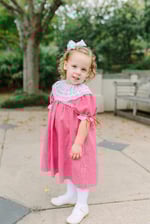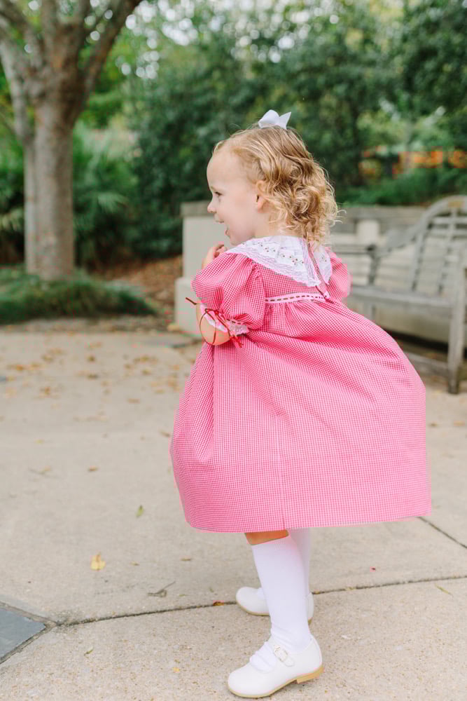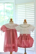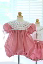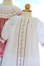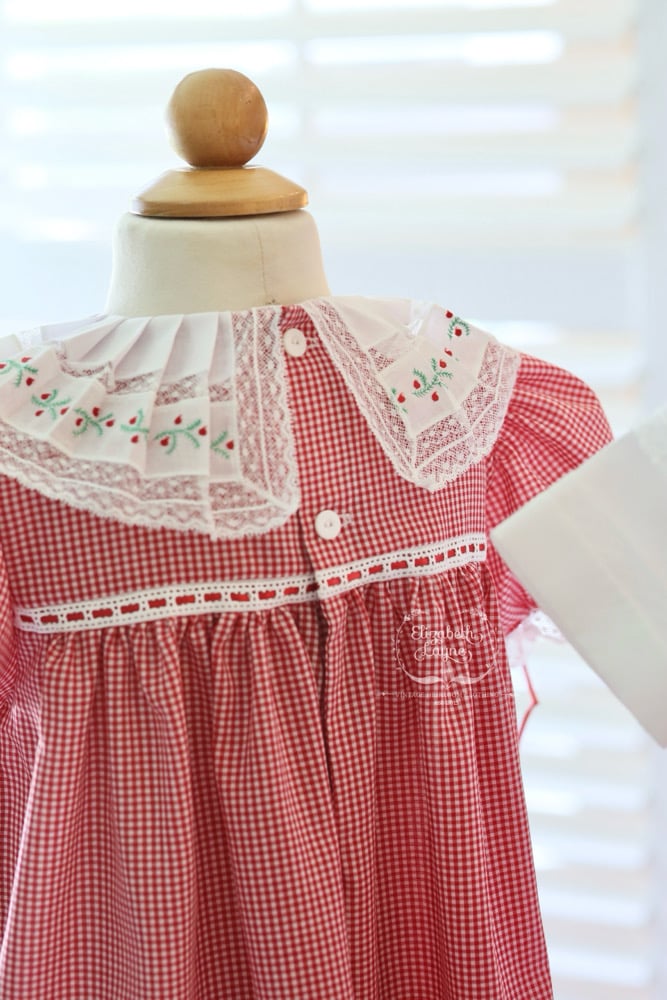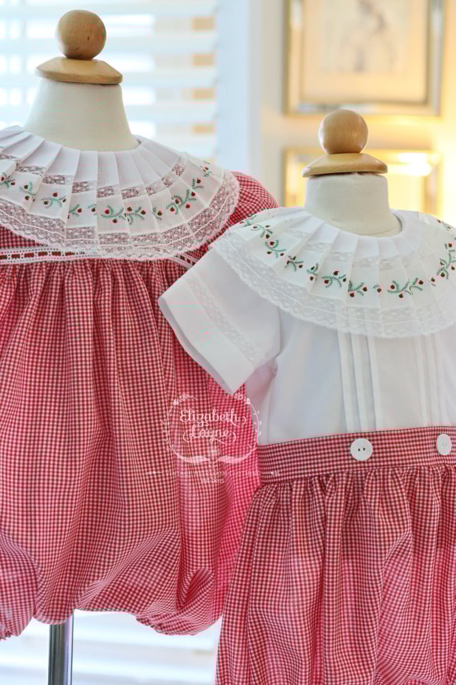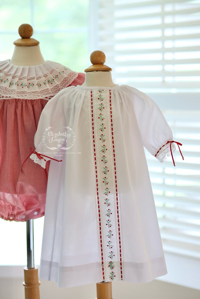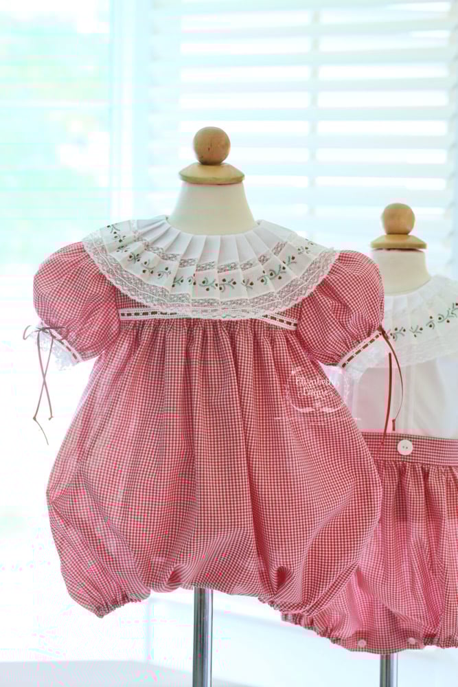 • The girls bubble and dress features a special pleated heirloom collar that has sweet holly handloom inserted into it