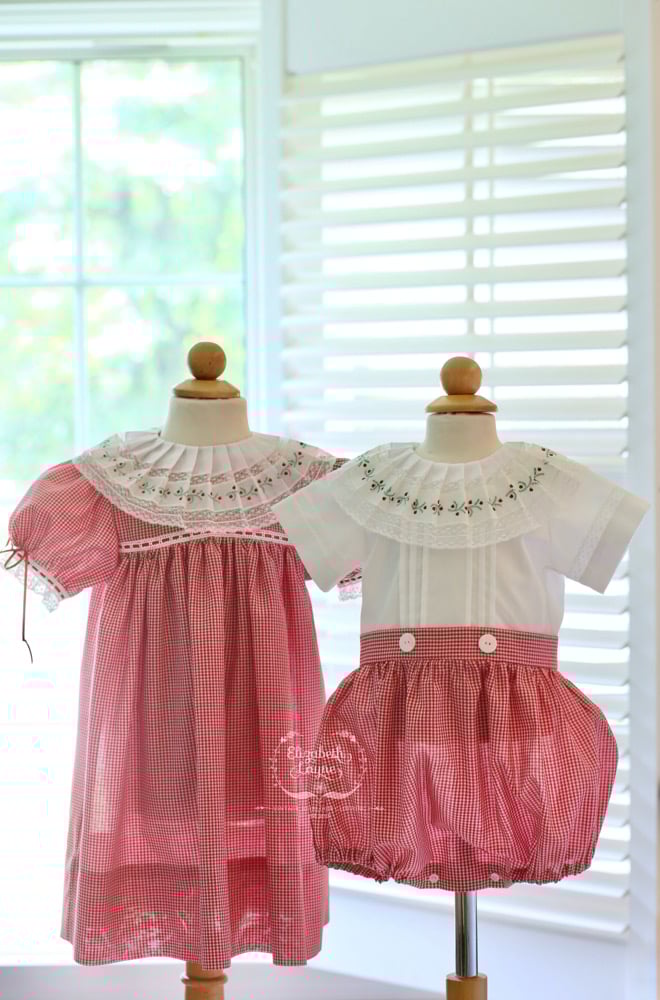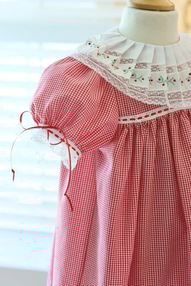 • Yokes have a dainty Swiss beading insertion with red satin ribbon in front and in back