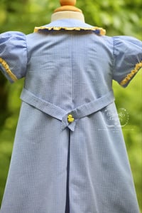 • Yellow gingham contrasting ruffle on her pocket, collar and puff sleeves