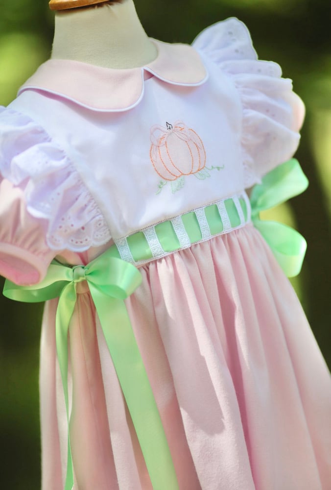 • Shadow work hand embroidery includes a sweet pumpkin and vines - and a pink bow for girl's pumpkins