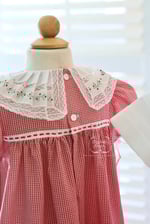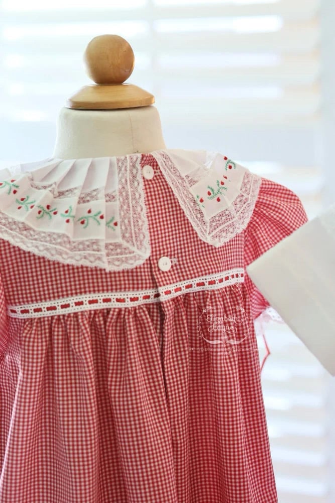 • features a special pleated heirloom collar that has sweet holly handloom inserted into it