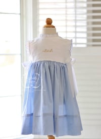 • Scalloped Swiss edging overlay collar has a sweet grouping of ducklings at play in flowers