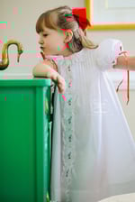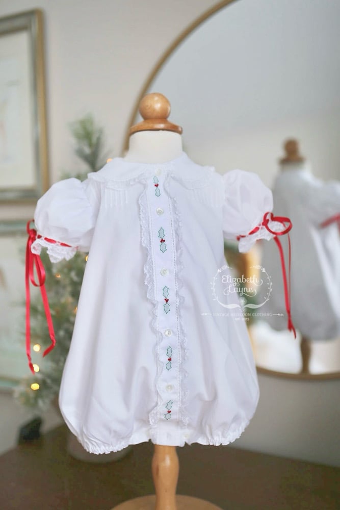 Classic white batiste and French laces with heirloom hand work sprinkled down the front of his or her heirloom dress, bubble, short set or button-on suit!