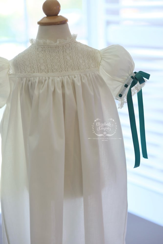Neckline and puffed sleeves are finished with coordinating lace edging attached to entredeux. The sleeves on this style dress are finished with embroidered cotton Swiss beading and ecru or white ribbon.